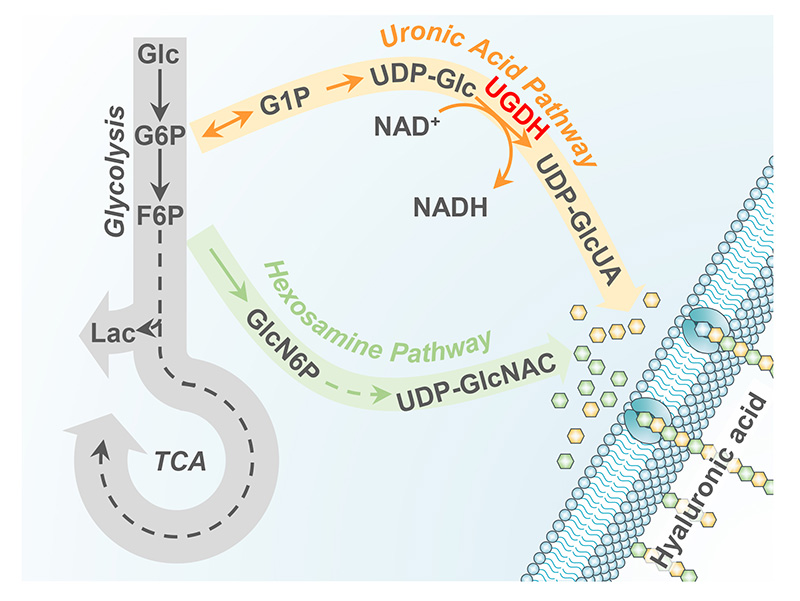 图1 糖醛酸途径。糖醛酸途径是糖酵解的分支通路。糖醛酸途径的原料来自于糖酵解的中间代谢产物葡萄糖6-磷酸。经过几步反应最终生成UDP-葡萄糖醛酸。UDP-葡萄糖醛酸与己糖胺途径(Hexosamine Pathway)生成的UDP-乙酰氨基葡萄糖一起用于糖胺聚糖,如透明质酸(Hyaluronic Acid, HA)等物质的生物合成。